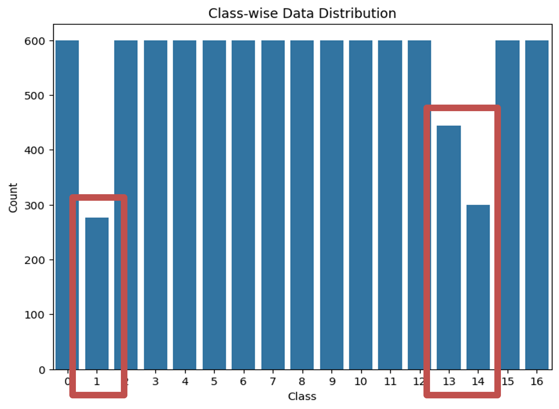 그리고 train 데이터셋은 1, 13, 14번 클래스의 데이터 수가 다른 클래스들보다 확연히 적었다.