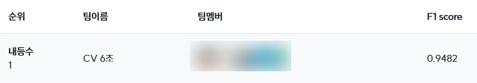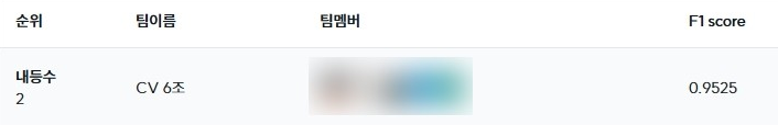 최종 점수 test 데이터셋의 일부만 사용해서 평가할 때는 F1-Score가 0.9525 였지만, 전체 test 데이터셋으로 평가한 F1-Score가 0.9482로 약간 떨어졌음에도 등수는 올라간 것을 보고, 다른 팀이 만든 모델보다 우리 팀이 만들 모델이 비교적 좀 더 안정적이고 정확하게 예측해서 등수가 바뀌는 결과로 나타났다고 생각했다.